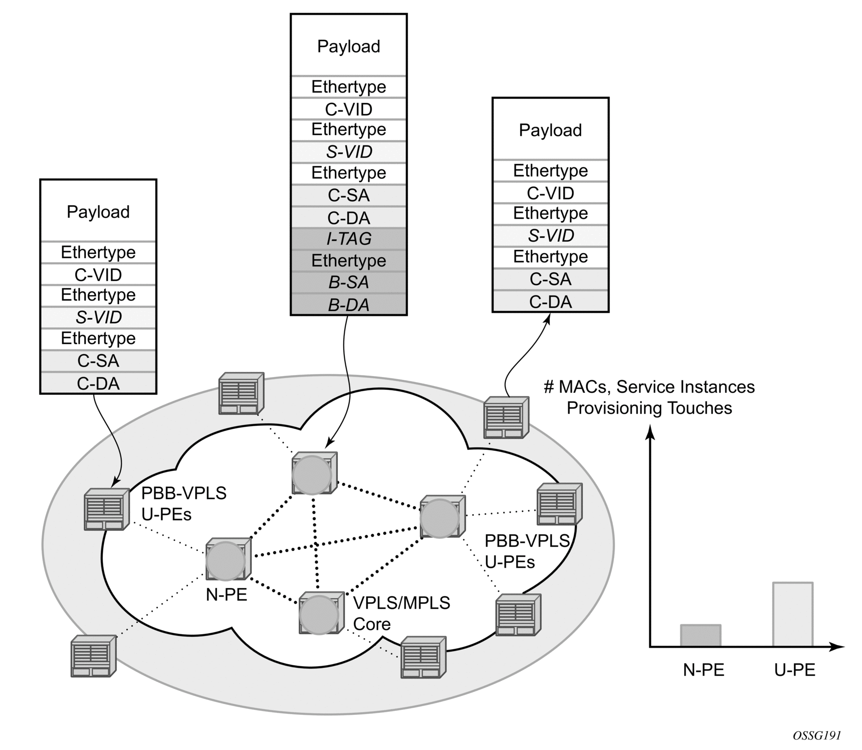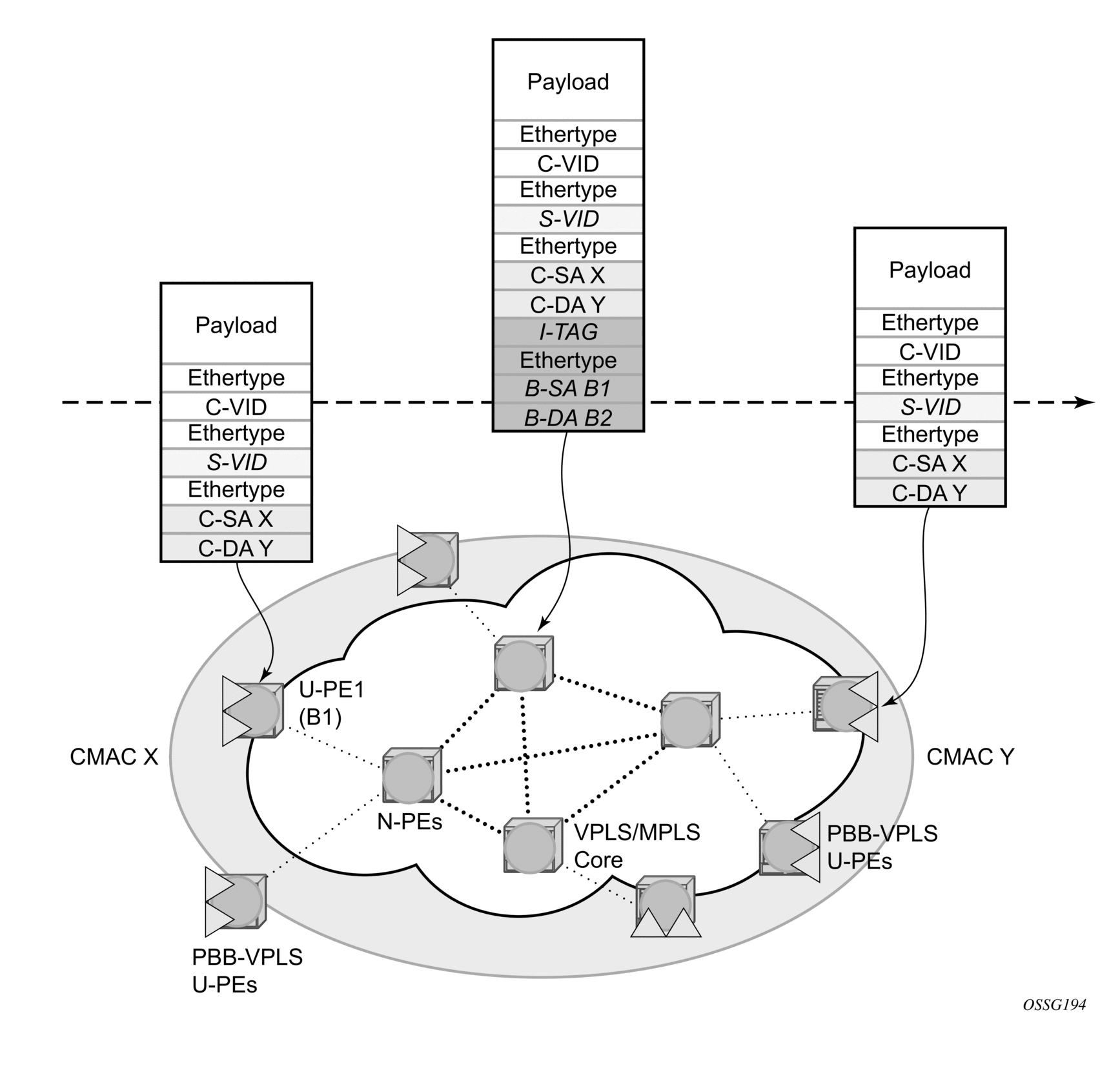 PBB adds a regular Ethernet header where the B-DA and B-SA are the backbone destination and respectively, source MACs of the edge U-PEs. The backbone MACs (B-MACs) are used by the core N-PE devices to switch the frame through the backbone.