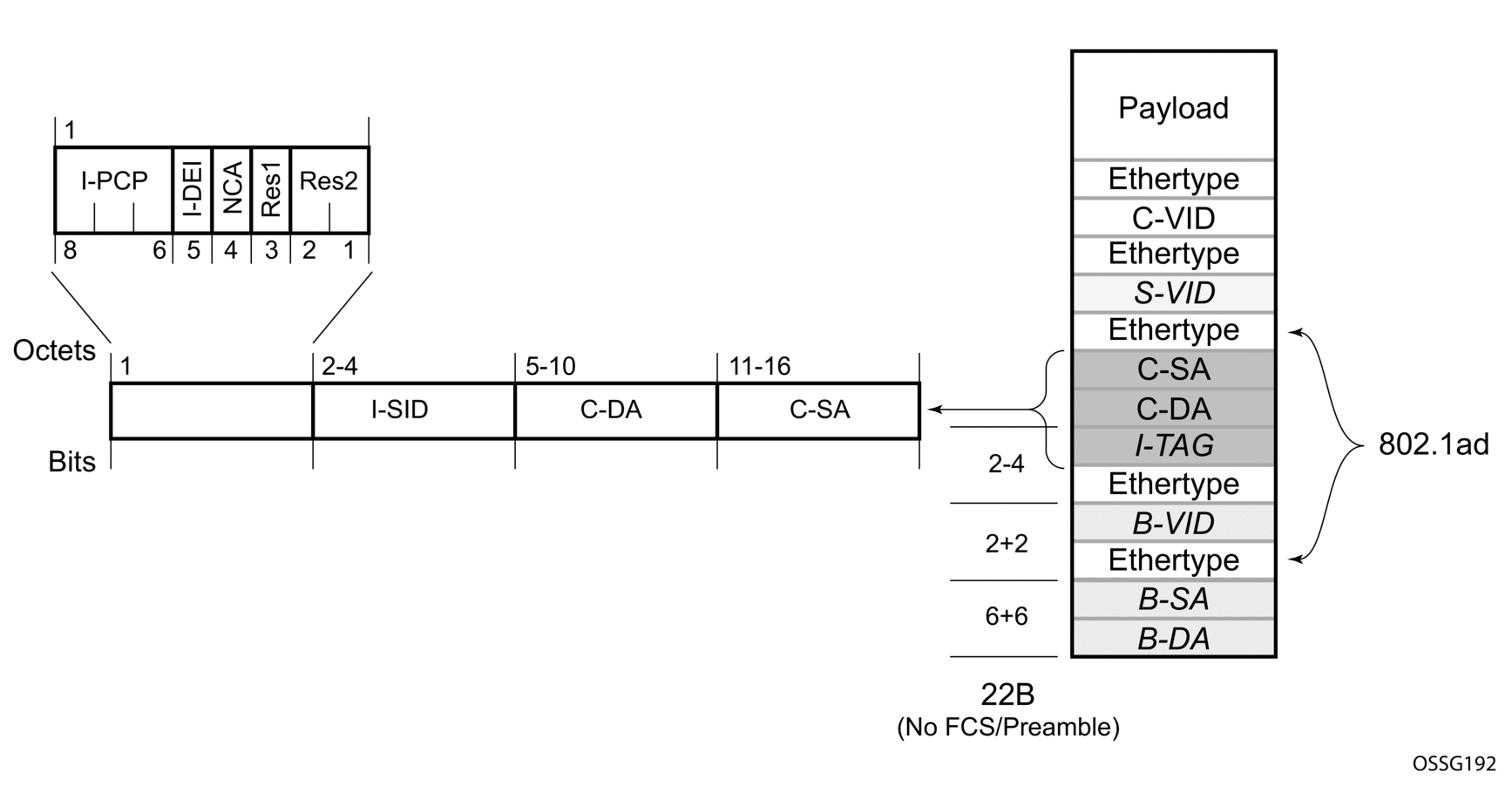 The following ITAG (standard Ether-type value of 0x88E7) has the role of identifying the customer VPN to which the frame is addressed through the 24 bit ISID.
