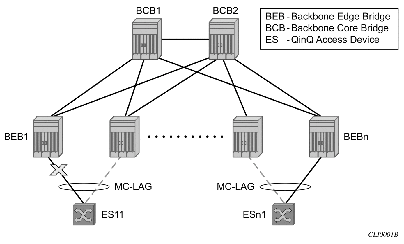 A PBB network using Native Ethernet core is shown in Figure 84. MC-LAG is used to multi-home a number of edge switches running QinQ to PBB BEBs.