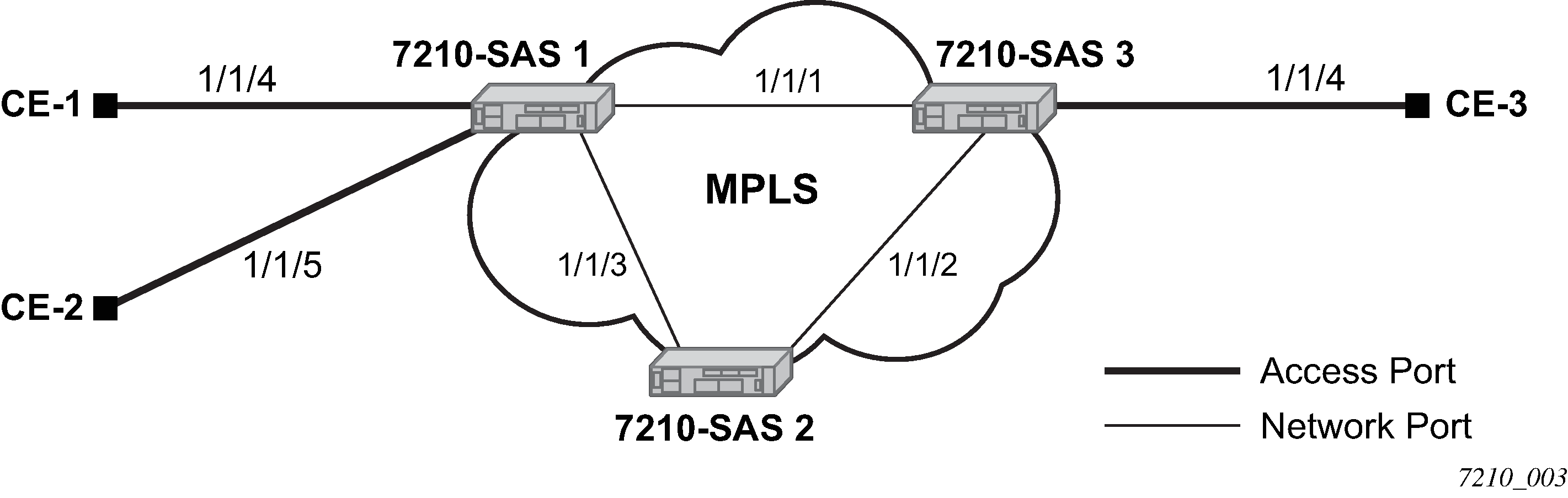 VPLS 100 is created on 7210 SAS-1 with spoke-SDPs on network port 1/1/1 and 1/1/3, and SAPs on 1/1/4 and 1/1/5 as part of this VPLS. CE1, CE2 and CE3 are the customer sites.