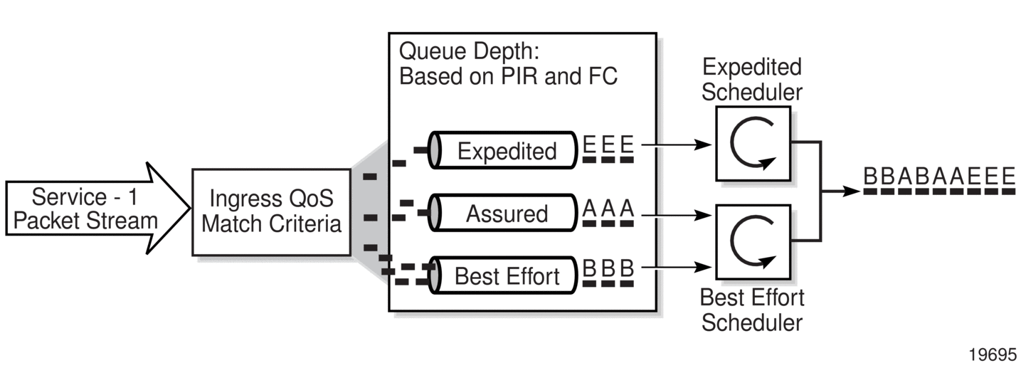 On service egress, the high-priority-only reservation for a queue is defined in the service egress QoS policy. Service egress queues are specified by forwarding class. High-priority traffic for a given traffic class is traffic that has been marked as in-profile either on ingress classification or based on interpretation of the QoS markings.