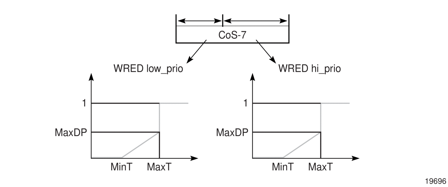WRED slope curves can run against high-priority and low-priority traffic separately for ingress and egress queues. This allows the flexibility to treat low-priority and high-priority traffic differently. WRED slope policies are used to configure the minT, maxT and maxDP values, instead of configuring these thresholds against every queue. It is the slope policies that are then applied to individual queues. Thus, WRED slope policies affect how and when the high-priority and low-priority traffic is discarded within the same queue.