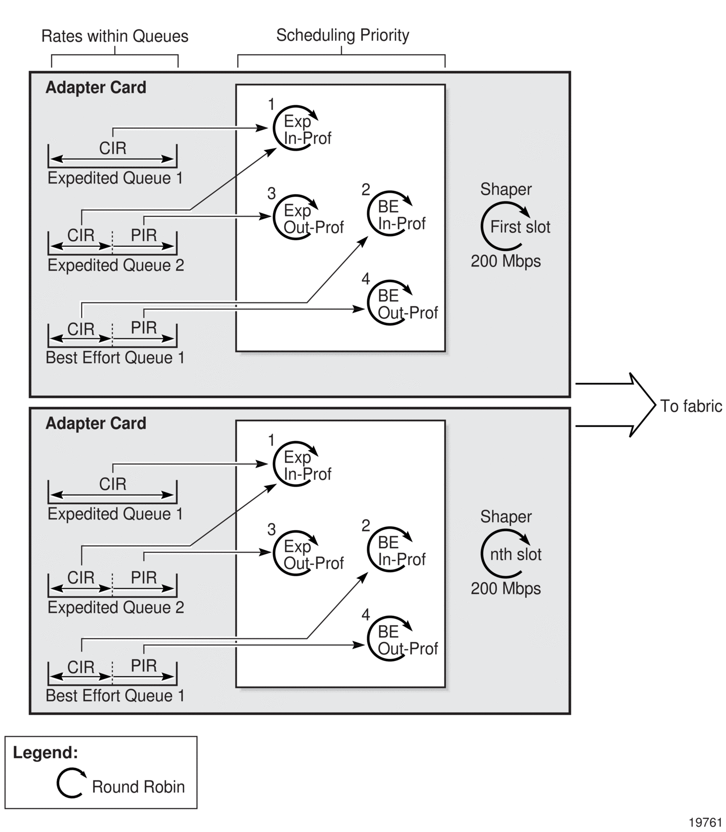 A 4-priority scheduler on the network processor of a third-generation (Gen-3) Ethernet adapter card or platform can be programmed at an operational CIR rate that exceeds 1.0% of the configured CIR rate. The PIR rate (that is, the maximum rate for the queue) and the SAP aggregate rates (CIR and PIR), maintain an accuracy of +/- 1.0% of the configured rates.