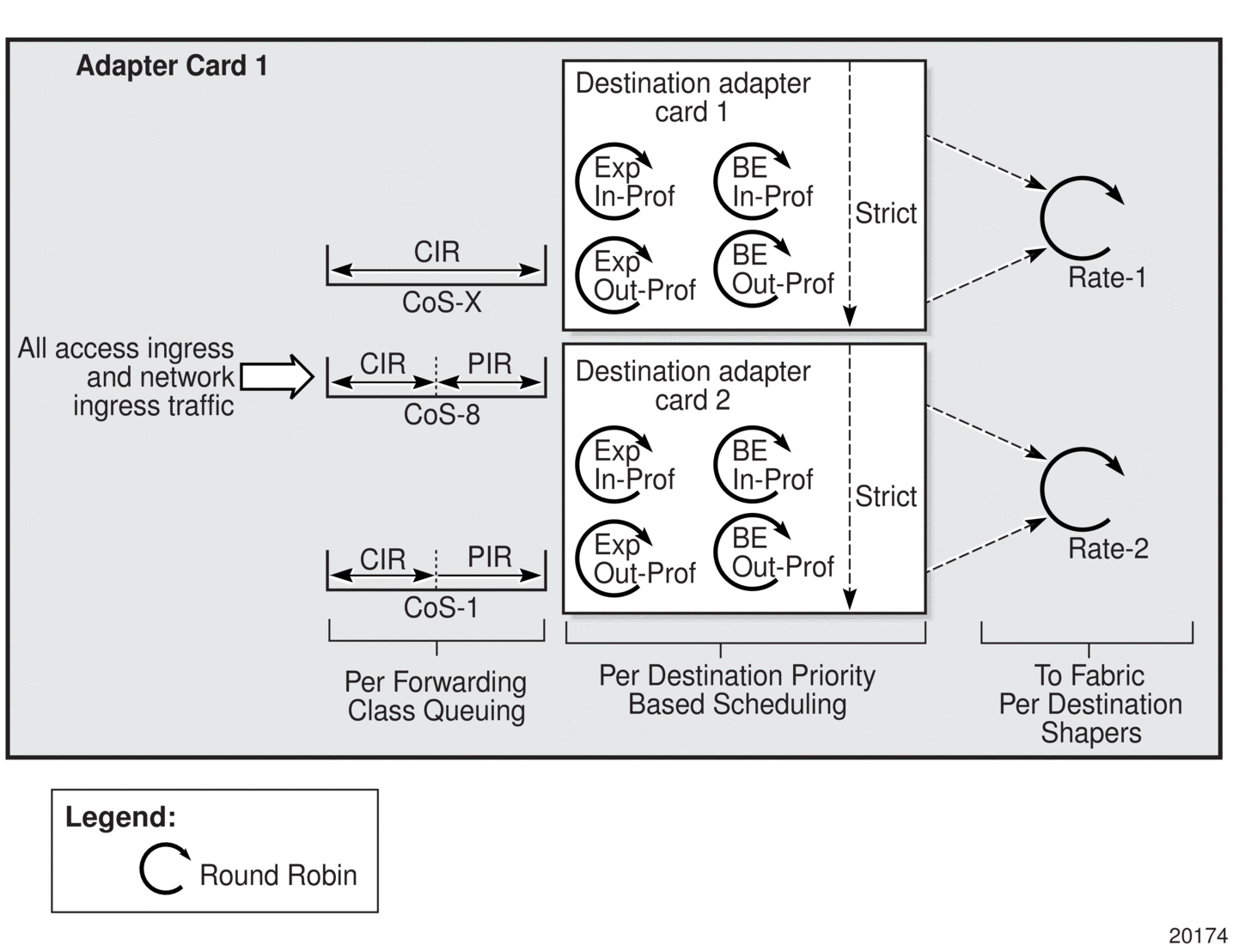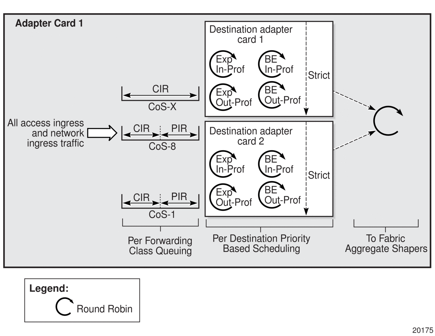 With priority mode, an access packet’s in-profile or out-of-profile state is based on the dynamic rate of the ingress queue prior to being forwarded to the fabric. When the queue rate is lower than or equal to the configured CIR, the packet is considered in-profile. When the queue rate is higher than the CIR, the packet is considered out-of-profile. The profile state is determined when the packet is scheduled out of the queue, not when the packet is buffered into the queue.