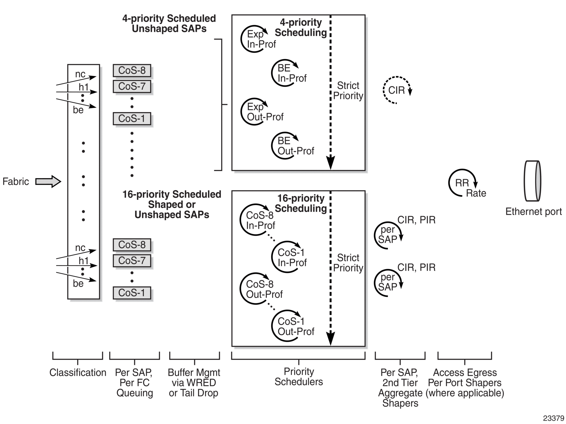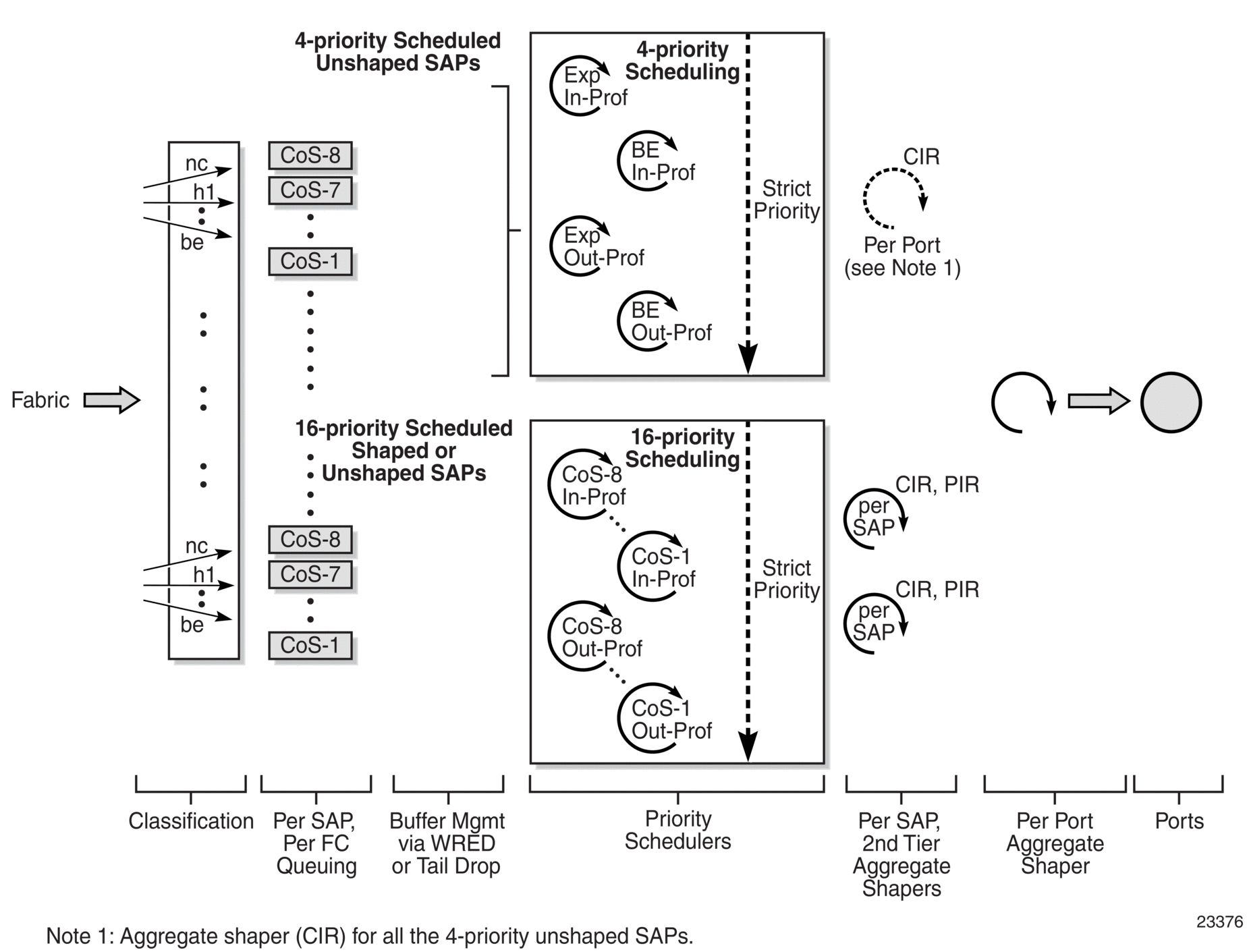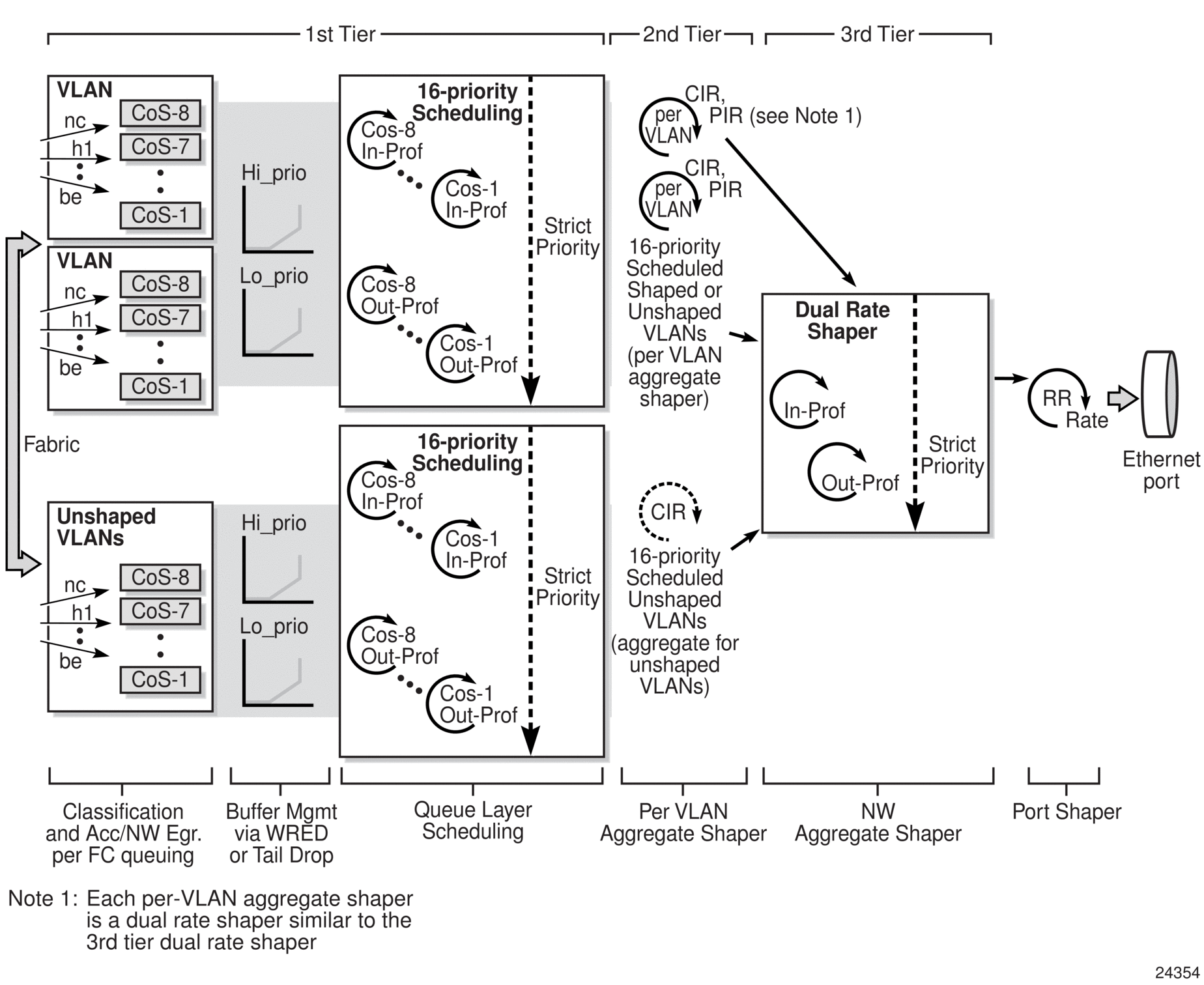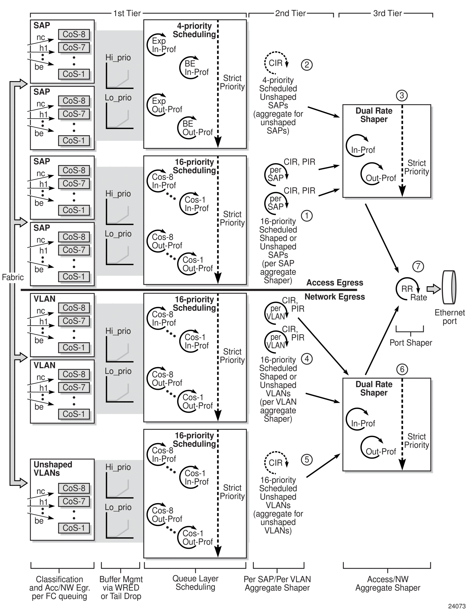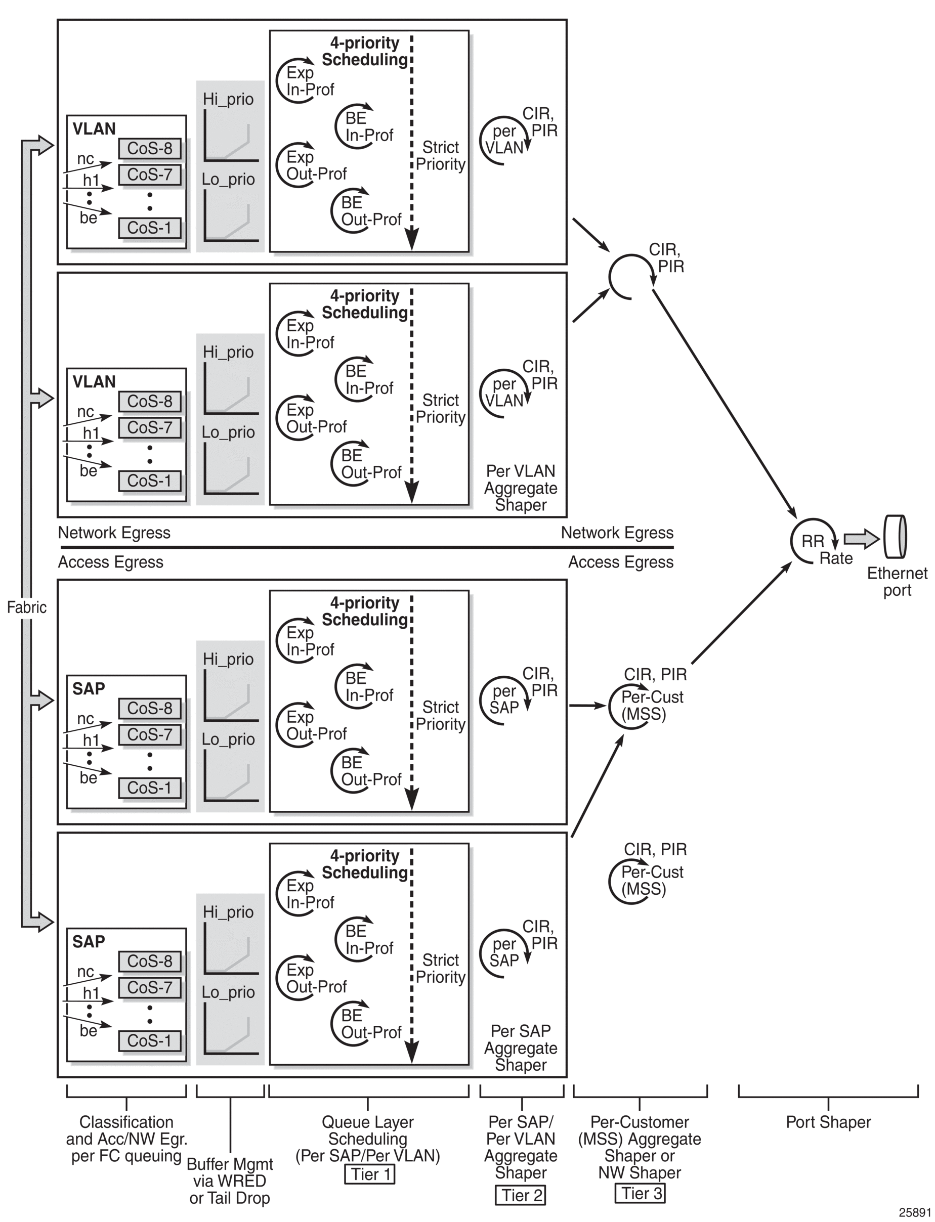 See Per-SAP Aggregate Shapers (H-QoS) On Gen-2 Hardware and Per-VLAN Network Egress Shapers for details on per-SAP and per-VLAN shapers.