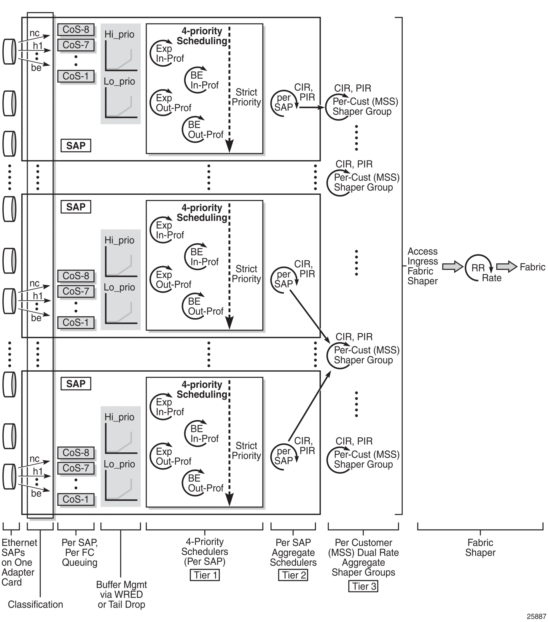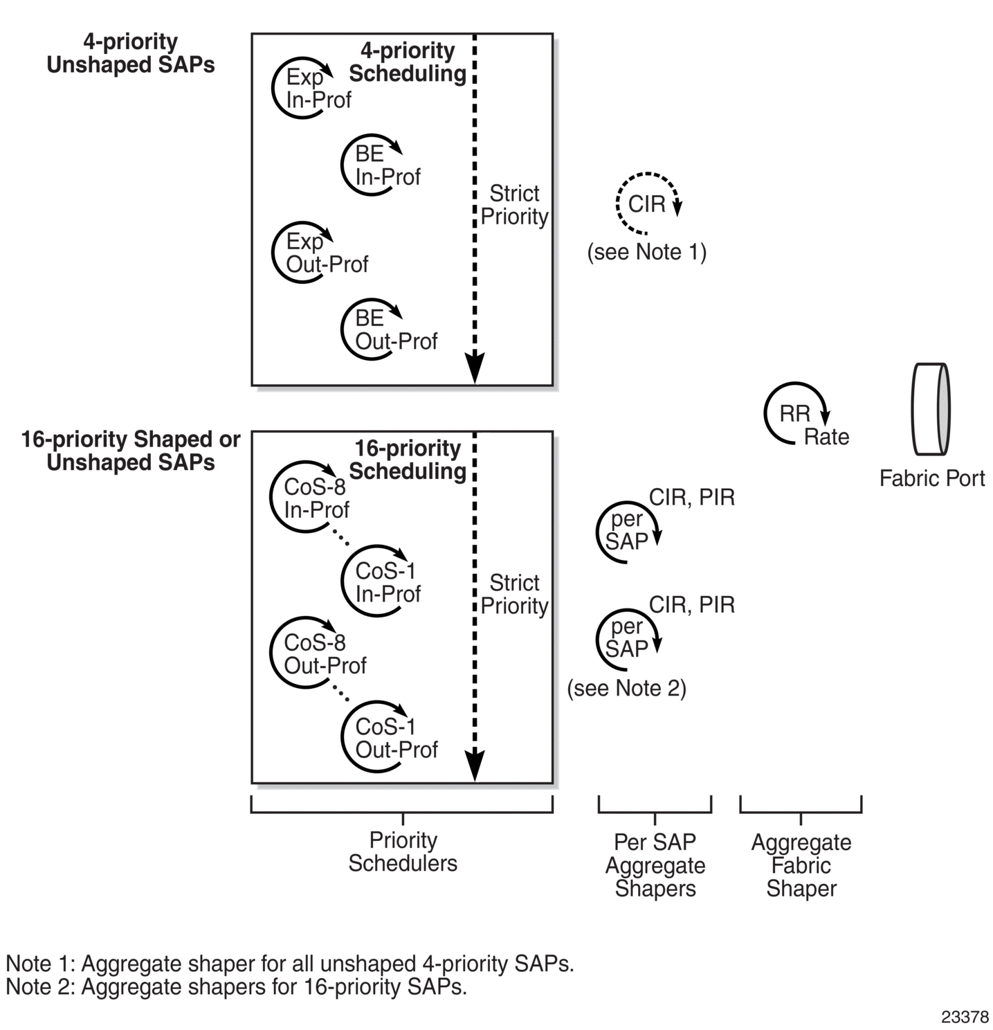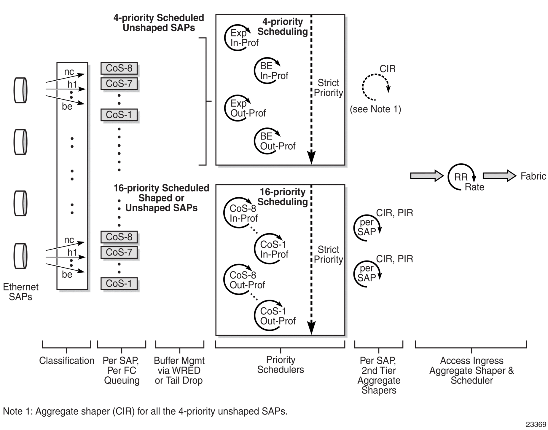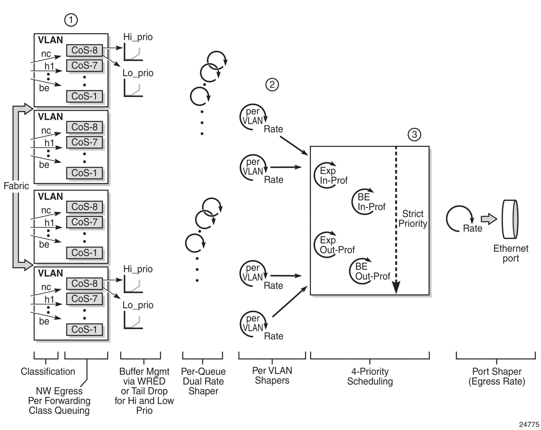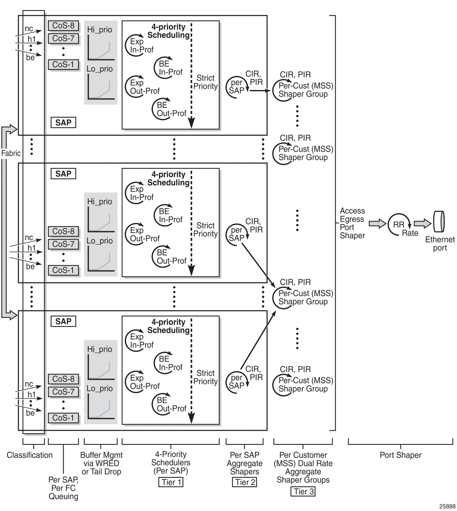 See Per-SAP Aggregate Shapers (H-QoS) On Gen-2 Hardware and Per-VLAN Network Egress Shapers for details on per-SAP and per-VLAN shapers.