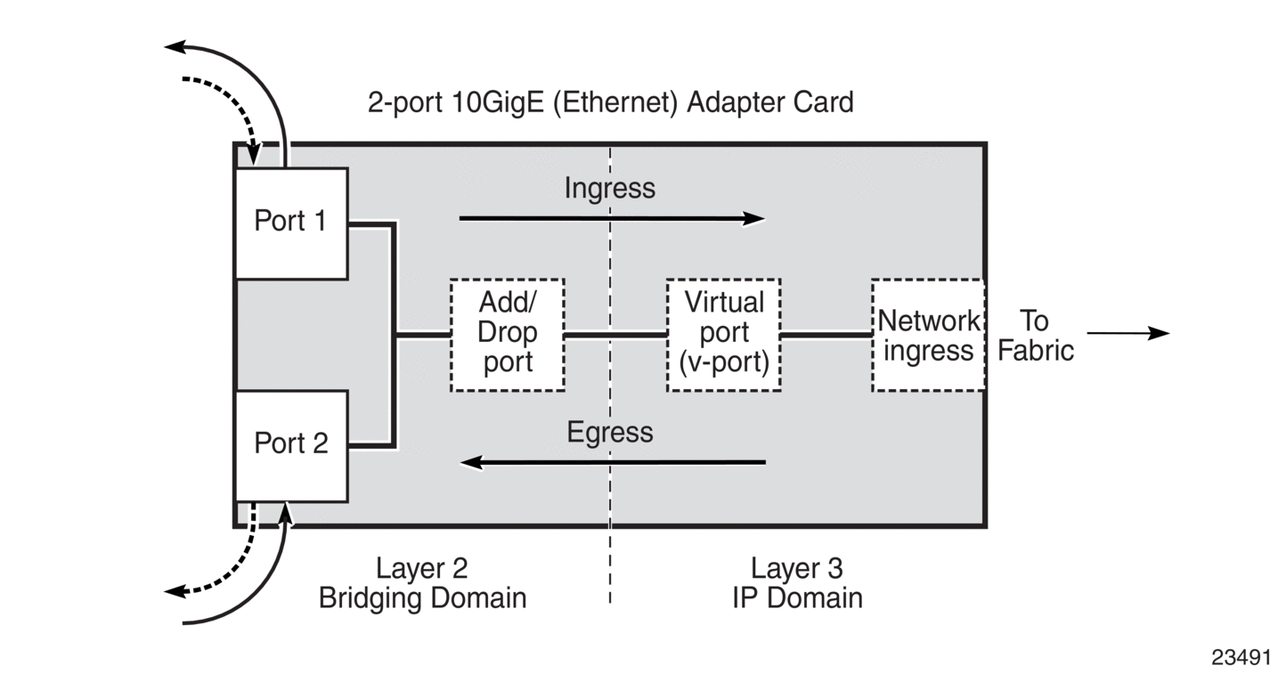 On the 2-port 10GigE (Ethernet) Adapter card and 2-port 10GigE (Ethernet) module, traffic can flow between the Layer 2 bridging domain and the Layer 3 IP domain (see Figure 2). In the bridging domain, ring traffic flows from one ring port to another, as well as to and from the add/drop port. From the network point of view, traffic from the ring towards the add/drop port and the v-port is considered ingress traffic (drop traffic). Similarly, traffic from the fabric towards the v-port and the add/drop port is considered egress traffic (add traffic).