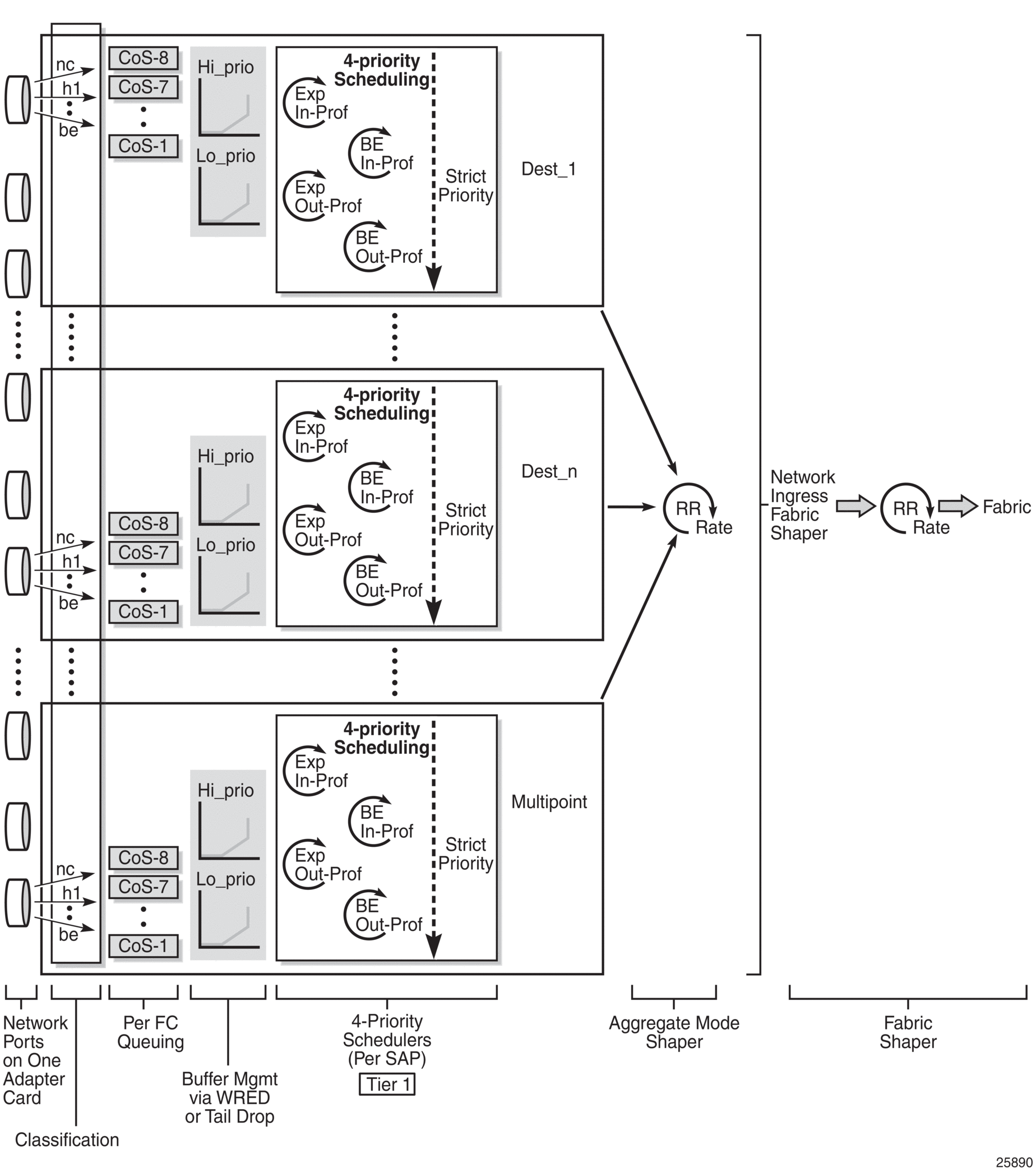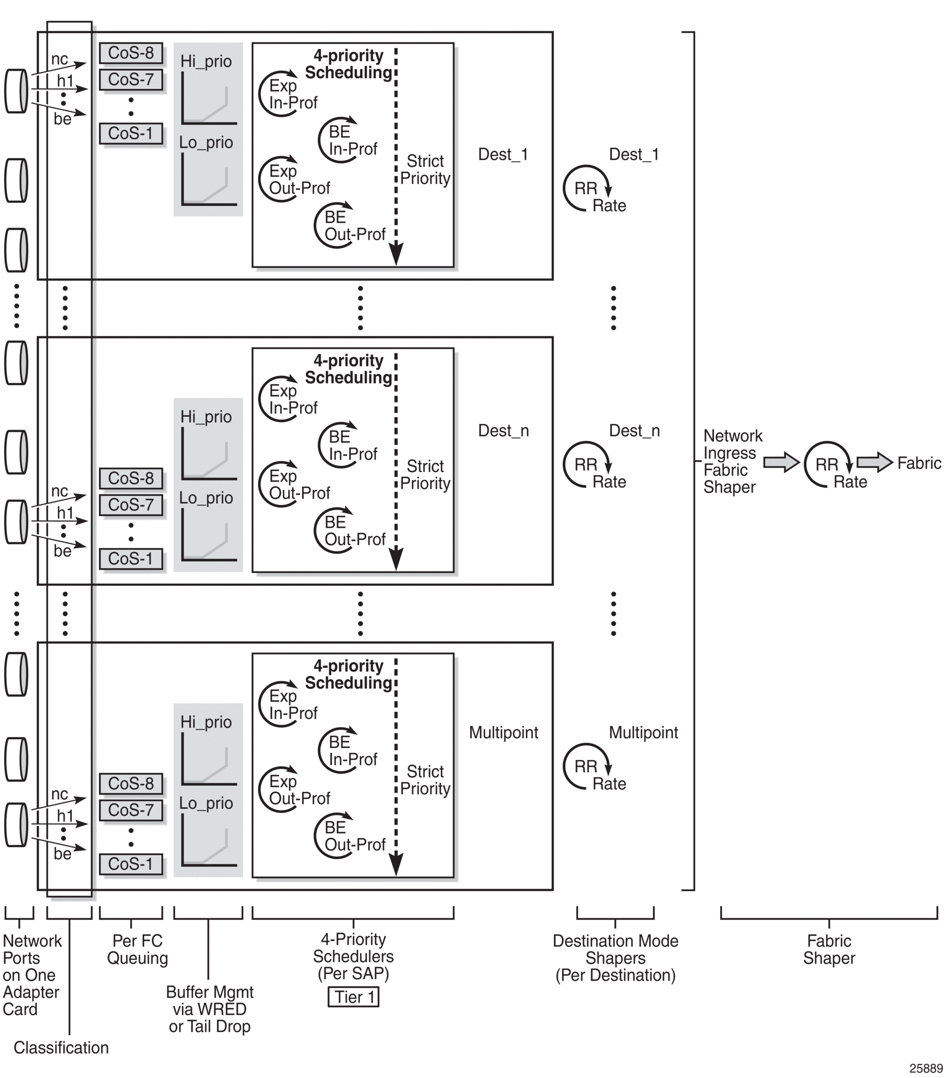 The high-priority-only buffers for network queues are defined within network queue policies based on the forwarding class. High-priority-only traffic for a specific traffic class is marked as in-profile either on ingress classification or based on interpretation of the QoS markings.