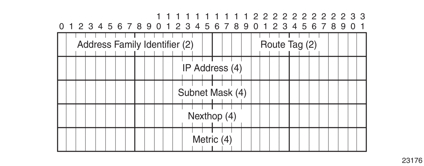There can be 1 to 25 route entries. The RIP packet header format is displayed in Figure 47. Figure 48 and Figure 49 display the RIPv1 and RIPv2 packet formats.