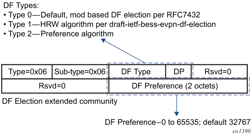 When an ES is configured to use the preference-based algorithm, the ES route is advertised with the DF election extended community attribute (sub-type 0x06). Figure 173 shows the DF election extended community.