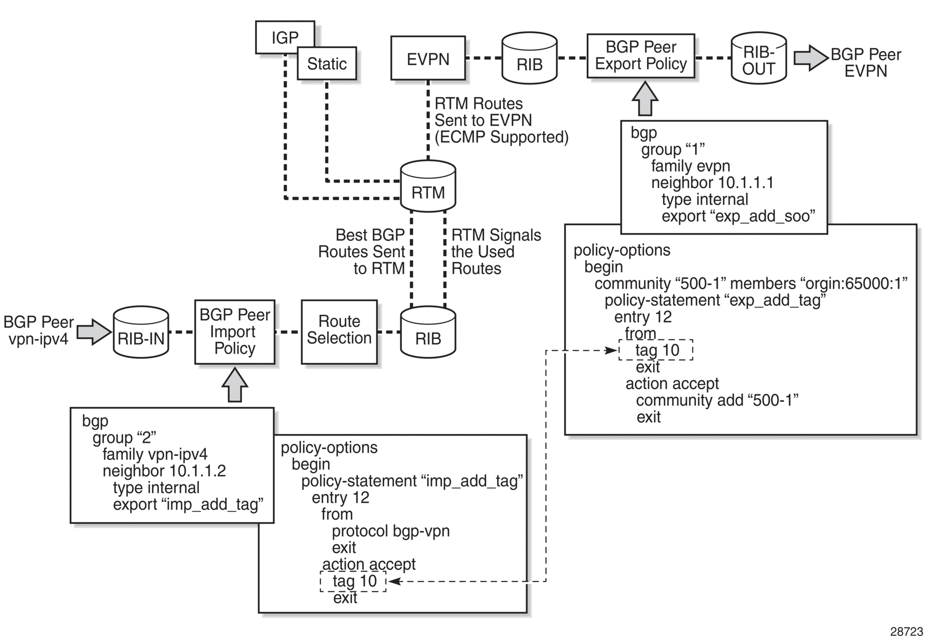 | Note: VPN-IPv4 routes can be tagged at ingress, and that tag is preserved throughout the RTM and EVPN processing so that the tag can be matched at the egress BGP routing policy. |