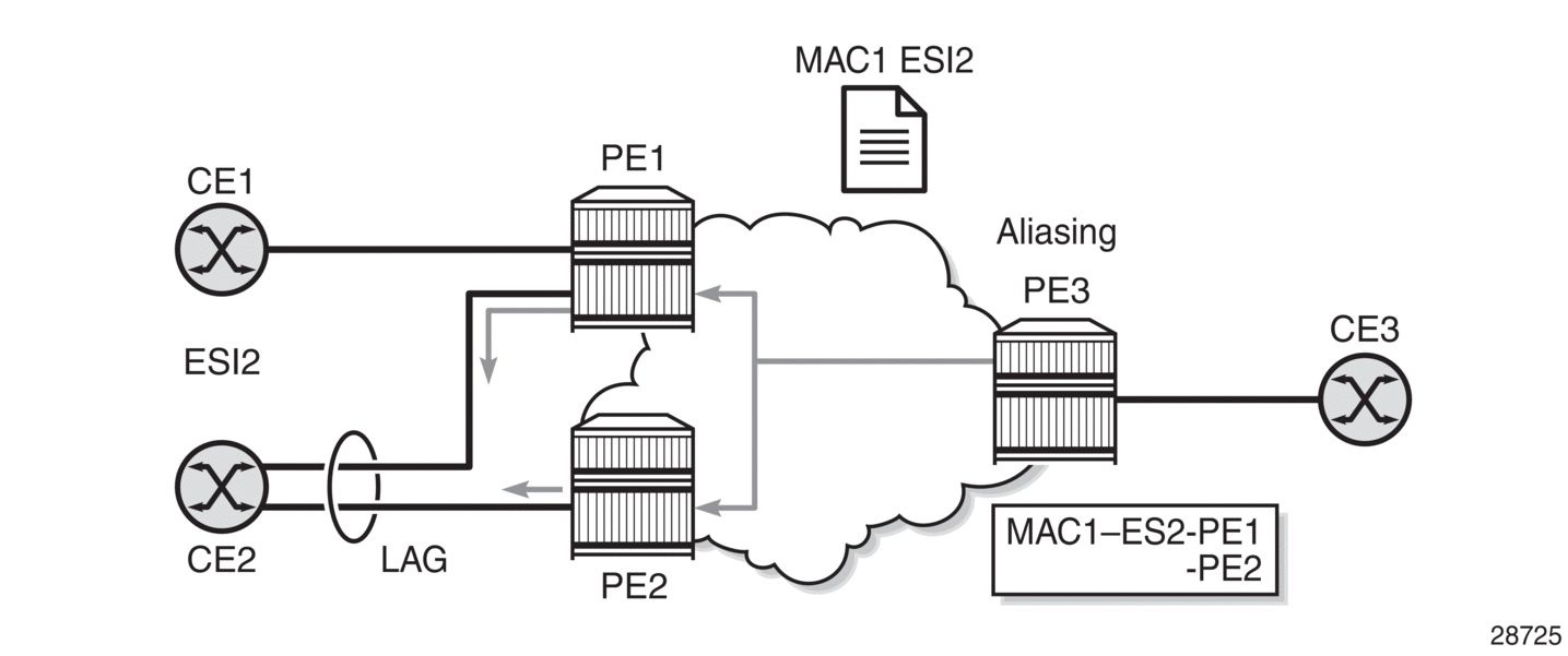 Aliasing is supported for traffic sent to an Ethernet segment destination. If ECMP is enabled on the ingress PE, per-service load balancing is performed to all PEs that advertise P=1. The PEs that advertise P=0 are not considered as next hops for an ES destination.