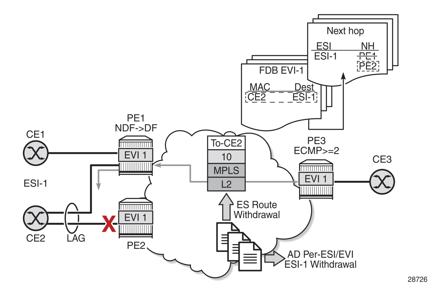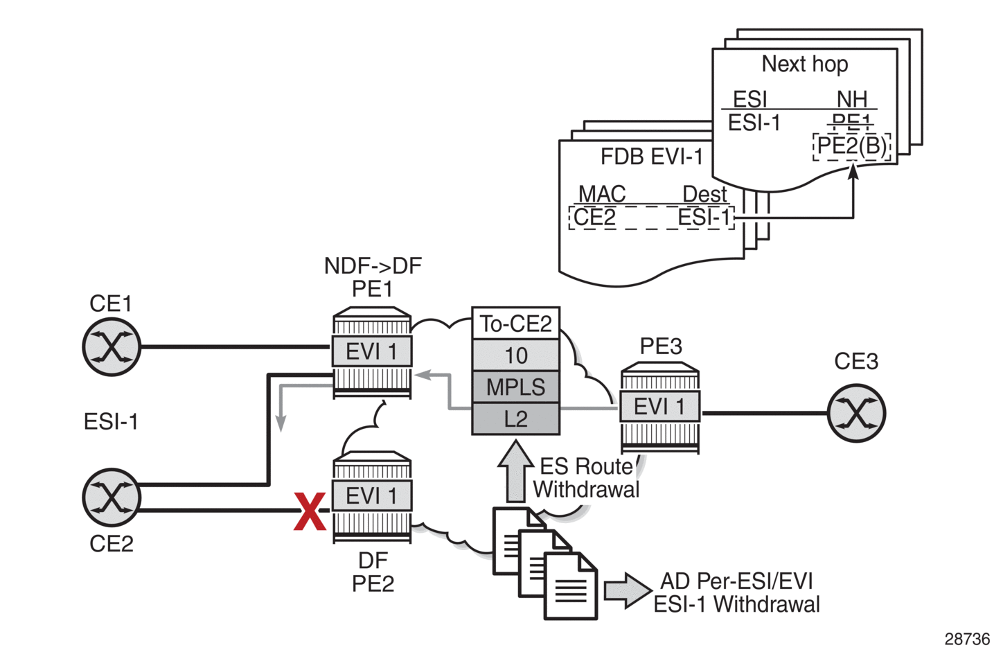 If PE3 receives AD routes for the same ESI and EVI from more than two PEs, the PE does not install any backup route in the data path. Upon receiving an AD per-ES or per-EVI route withdrawal for the ESI, the PE flushes the MAC addresses associated with the ESI.