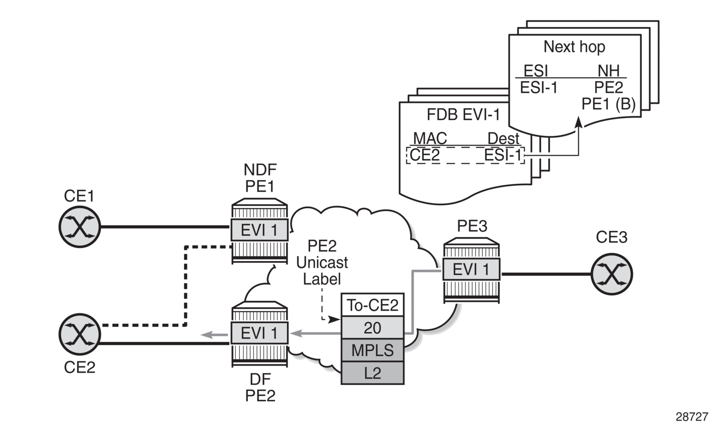 Also, a DF election on PE1 is triggered. In general, a DF election is triggered by the same events as for all-active multihoming. In this case, the DF forwards traffic to CE2 when the es-activation-timer expiration occurs (the timer activates when there is a transition from non-DF to DF).