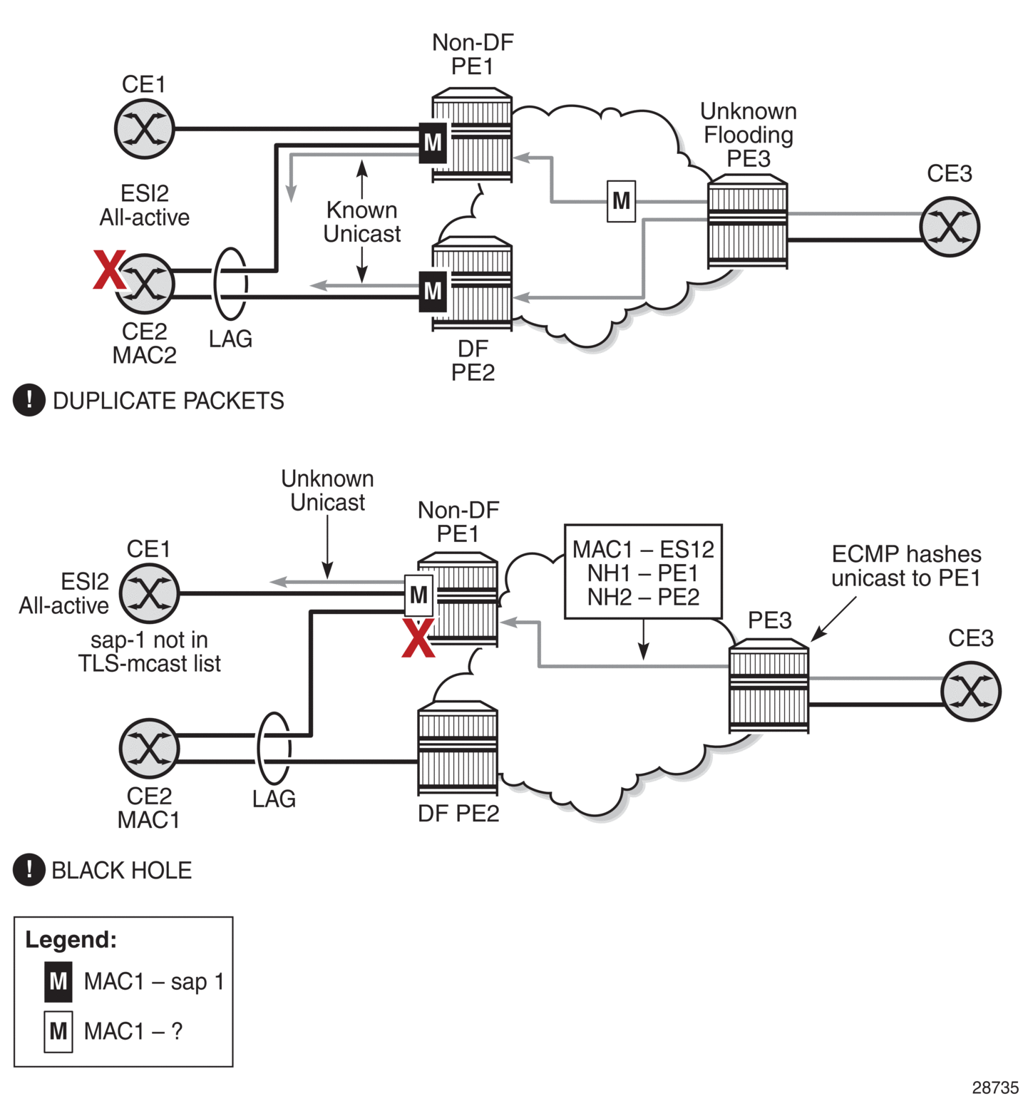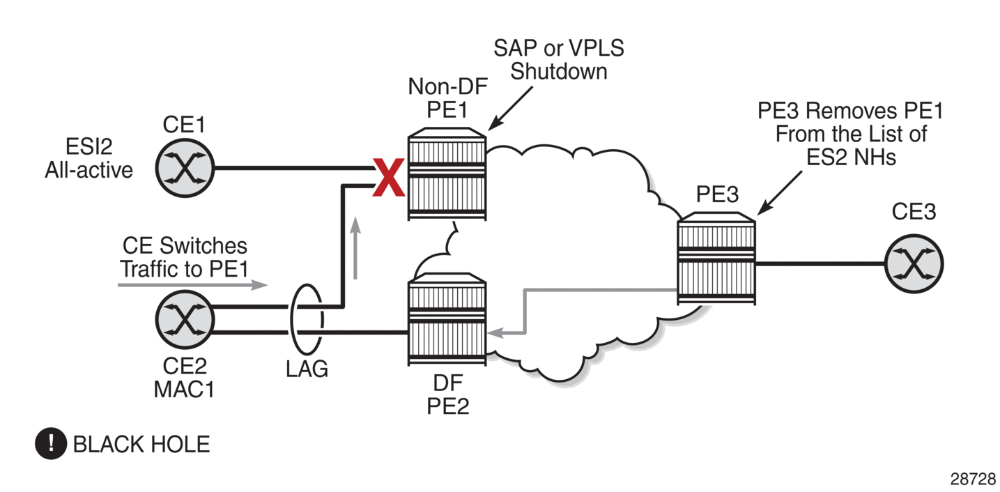 In all-active multihoming, the non-DF keeps the SAP operationally up, although it removes the SAP from the default flooding list. See the ES Discovery and DF Election Procedures (all-active multihoming) for more information. In the single-active multihoming implementation, the non-DF brings the SAP or SDP binding operationally down.