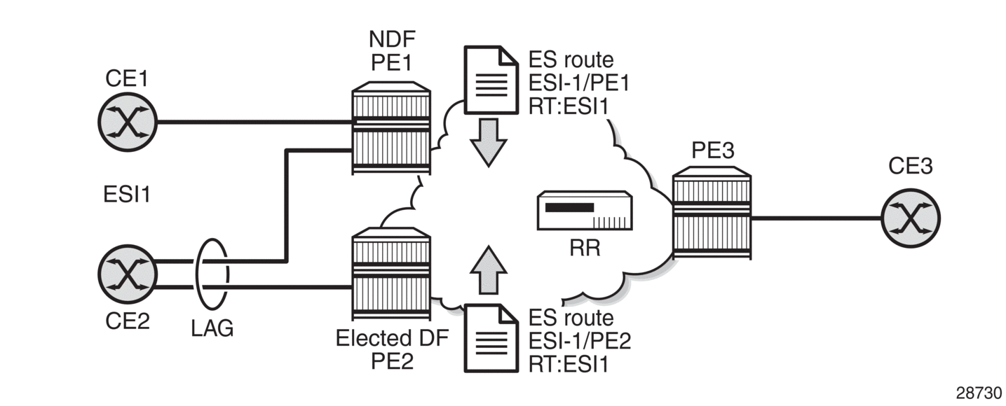 The 7705 SAR generates route type 4 for multihoming ES discovery and designated forwarder (DF) election.
