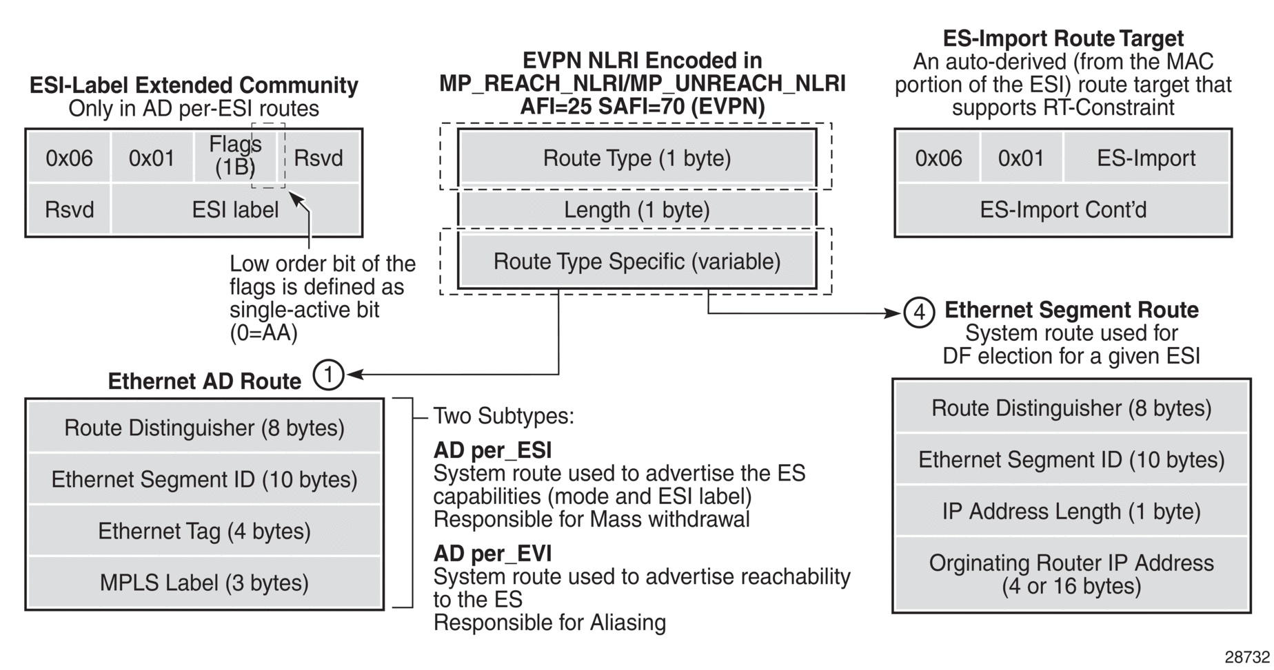 Type 1 – Ethernet Auto-Discovery route | Mass-withdrawal, Ethernet segment identifier (ESI) labels, aliasing |