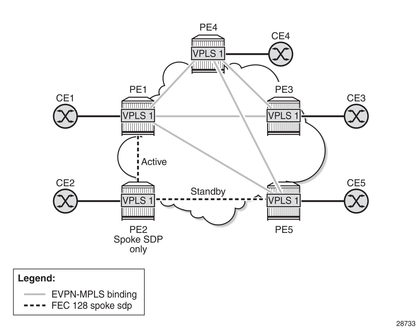 PE1, PE3, PE4, and PE5 have BGP-EVPN enabled in VPLS-1. PE2 has active/standby spoke SDPs to PE1 and PE5. In this configuration: