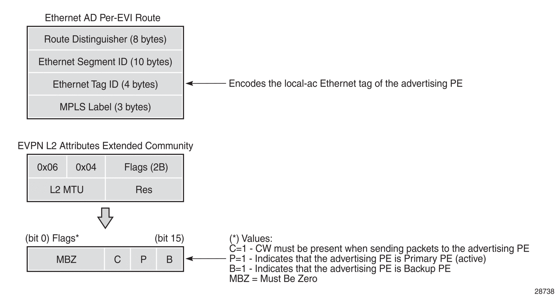 If the advertising PE has an access SAP-SDP or spoke SDP that is part of an ES, the AD per-EVI route is sent with the information described in the preceding list, with the following minor differences.