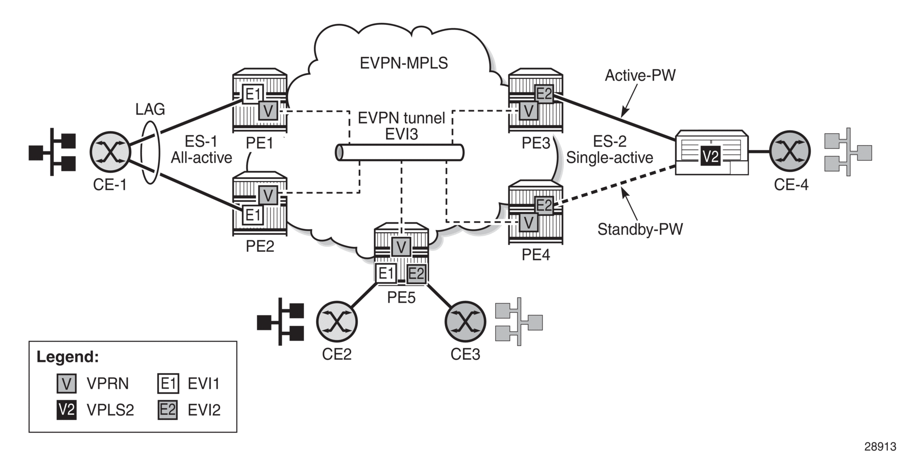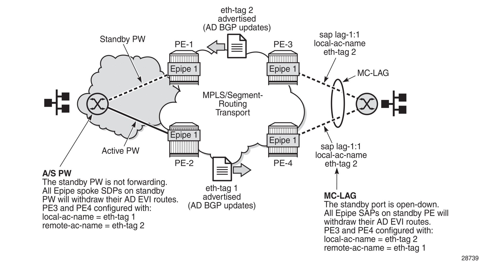 The use of active/standby (A/S) PW (for access spoke SDPs) and MC-LAG (for access SAPs) provides an alternative redundant solution for EVPN-VPWS that does not use the EVPN multihoming procedures described in IETF draft-ietf-bess-evpn-vpws. Figure 170 shows the use of both mechanisms in a single Epipe.