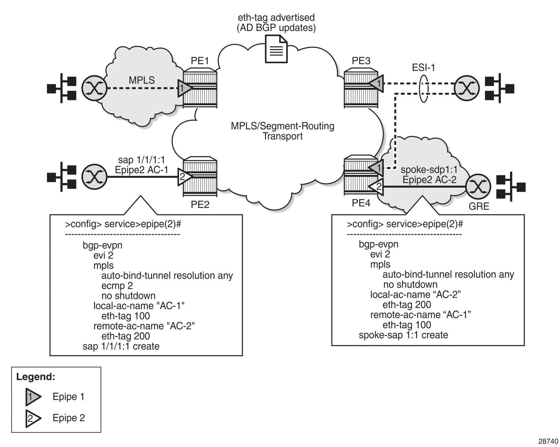BGP-EVPN can be enabled in Epipe services with either SAPs or spoke SDPs at the access, as shown in Figure 169.