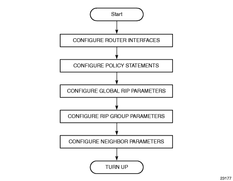 The minimum RIP configuration must define one group and one neighbor. The parameters configured at the RIP global level are inherited by the group and neighbor levels. Parameters can be modified and overridden on a level-specific basis. The RIP command hierarchy consists of three levels: