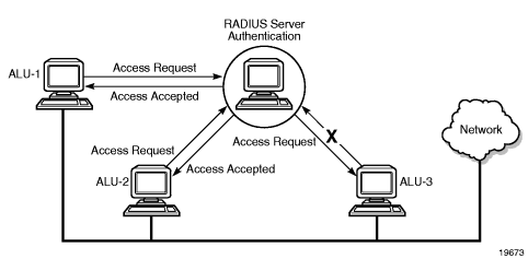 Figure 1 depicts end-user access requests sent to a RADIUS server. After validating the user names and passwords, the RADIUS server returns an access accept message to the users on ALU-1 and ALU-2. The user name and password from ALU-3 could not be authenticated, thus access was denied.