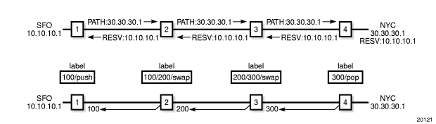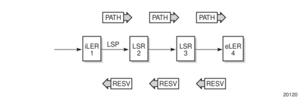 Figure 5 displays an example of an LSP path set up using RSVP-TE. The ingress label edge router (iLER 1) transmits an RSVP-TE PATH message (path: 30.30.30.1) downstream to the egress label edge router (eLER 4). The PATH message contains a label request object that requests intermediate LSRs and the eLER to provide a label binding for this path.