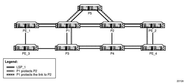 LSP_1 had requested node protection, but due to lack of an available path it could only obtain link protection. Therefore, every 60 s, the PLR for LSP_1 will search for a new path that might be able to provide node protection. When P4 is back online and such a path is available, a new bypass tunnel will be signaled and LSP_1 will be associated with this new bypass tunnel.