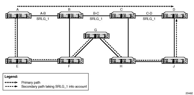 A path is considered to be SRLG disjoint from a given link (or node) if the path does not use any links (or nodes) that belong to the same SRLG as the given link (or node). Eligible disjoint paths are found by CSPF when the SRLG constraint is included in the CSPF route calculation (referred to as the strict SRLG condition).