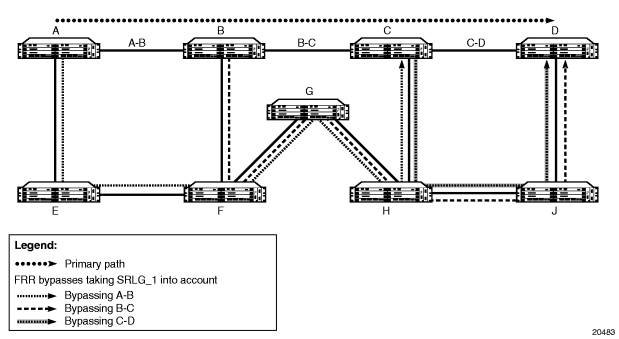 Figure 11 illustrates SRLG when FRR bypass is used, where SRLG_1 is the same as in Figure 10. Since FRR bypass is used, the following possible reroutes may occur, depending on where the failure occurs: