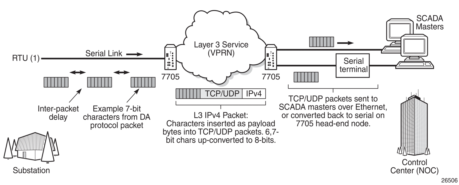 The serial data is received as characters that represent bytes in a packet. These bytes are packetized into Layer 3 TCP/UDP packets that are then transported or forwarded across the IP/MPLS network using the node's Layer 3 VPRN service constructs for routing. Figure 14 illustrates how serial data is encapsulated into TCP/UDP packets and transported over IP/MPLS. When using a cellular port, GRE-MPLS and encapsulations for the service would be included, but this is not shown in the figure.