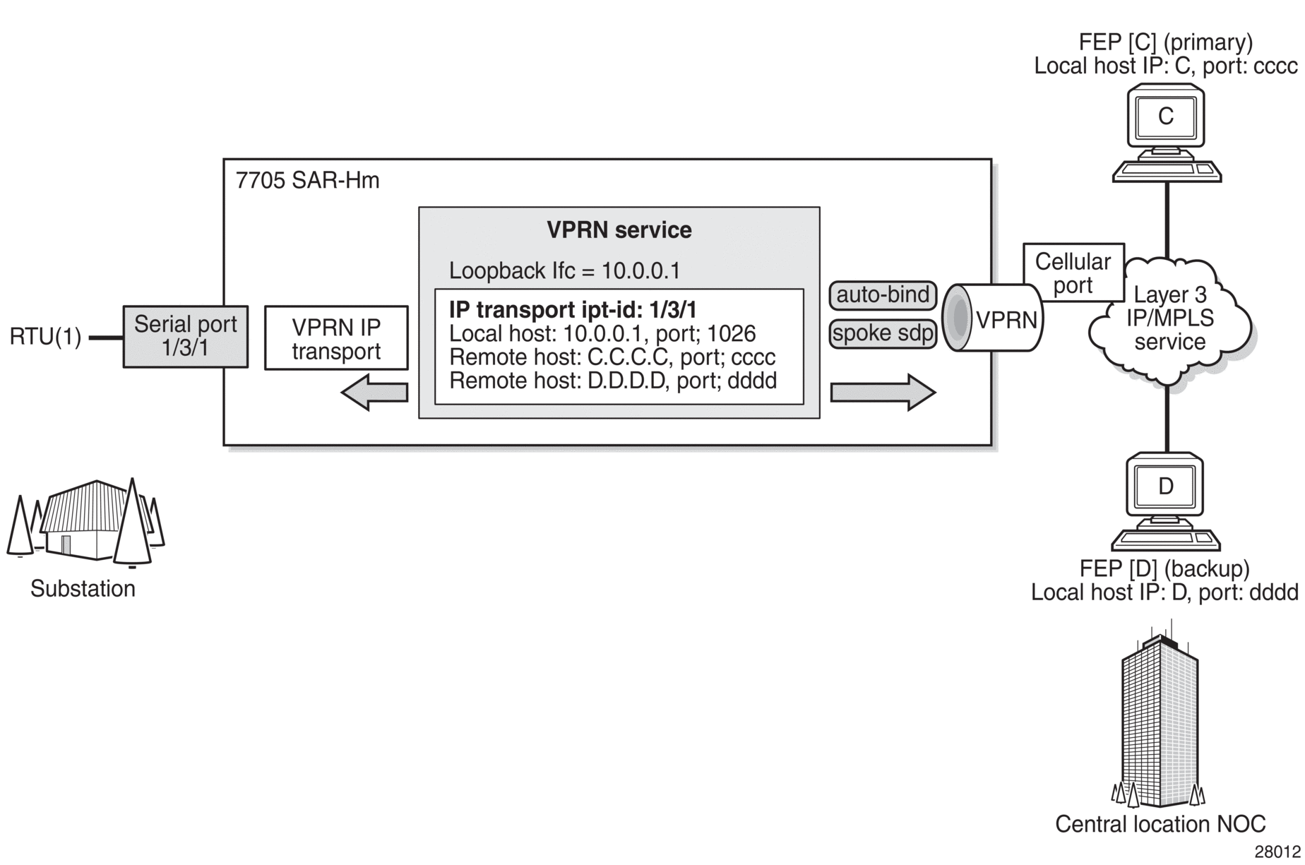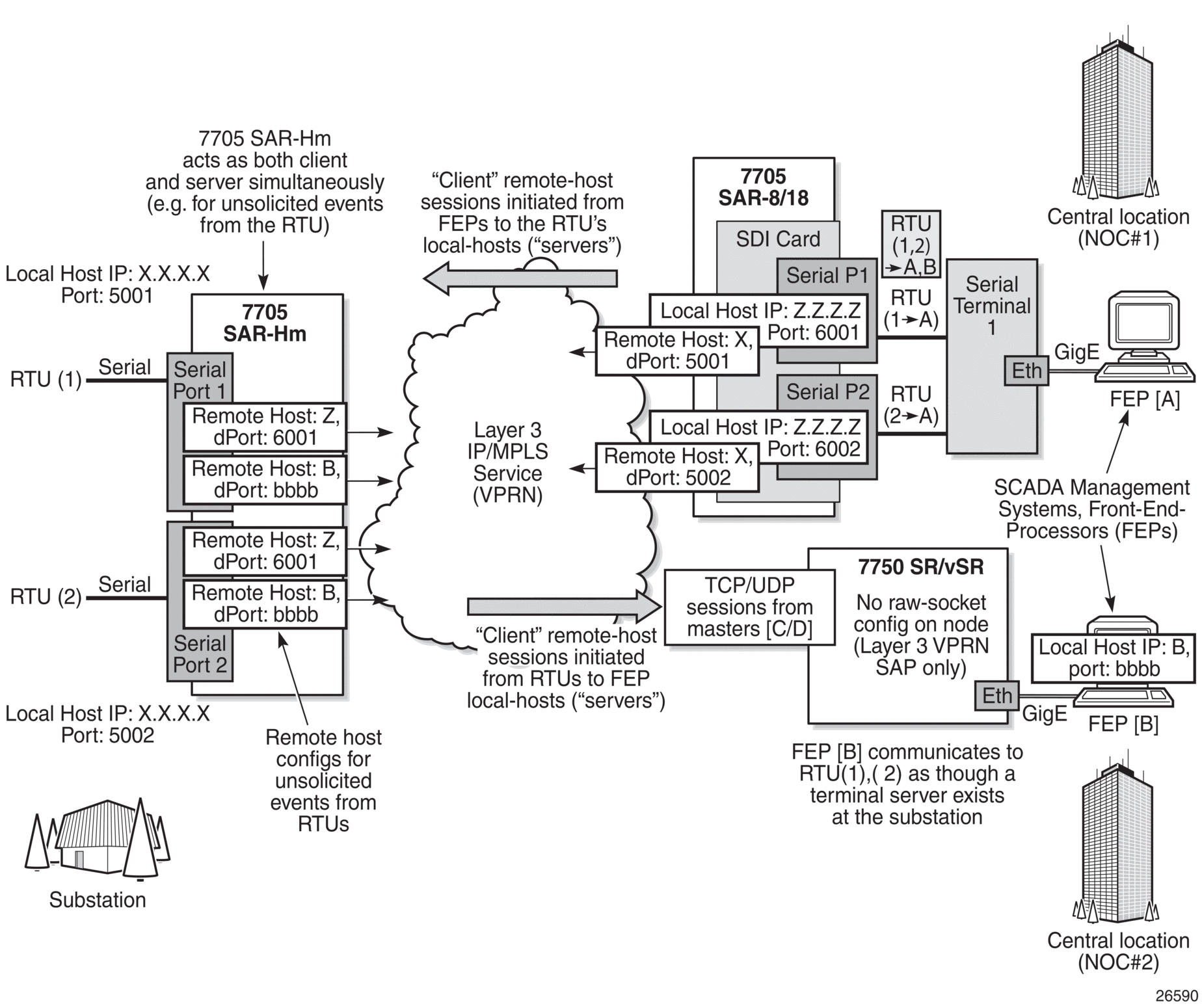 The bottom right 7750 SR or VSR node is connected to FEP server [B] directly using Ethernet. This FEP server reaches the RTUs via a Layer 3 VPRN service where TCP and UDP sessions originating from the FEP server [B] terminate on the 7705 SAR-Hm to deliver the raw socket serial data to the RTUs.