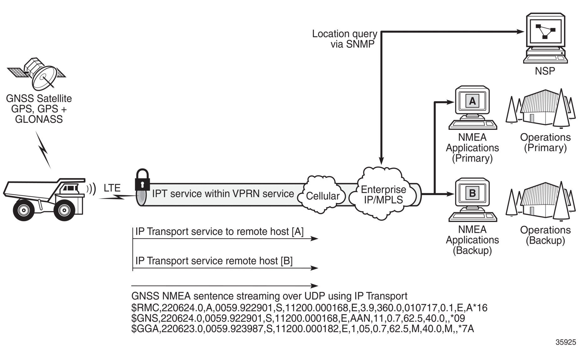 An IP transport subservice within a Layer 3 VPRN service can be configured to transmit GNSS NMEA data from the GNSS receiver (as the IP transport local host) to one or more remote hosts. See Figure 16. Any packets sent from remote hosts toward the local host of the IP transport subservice are dropped.