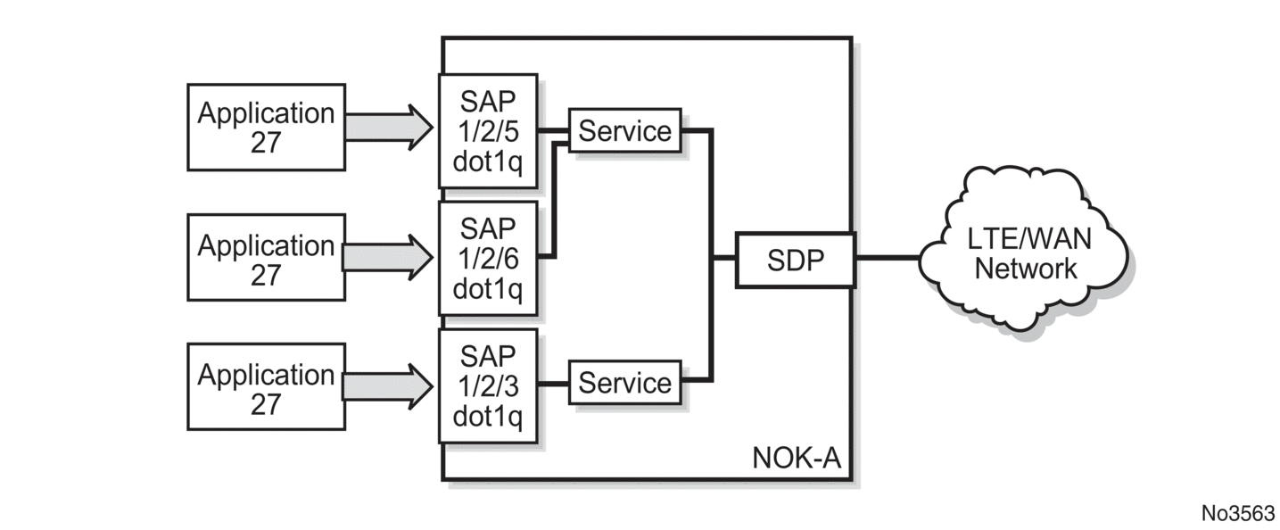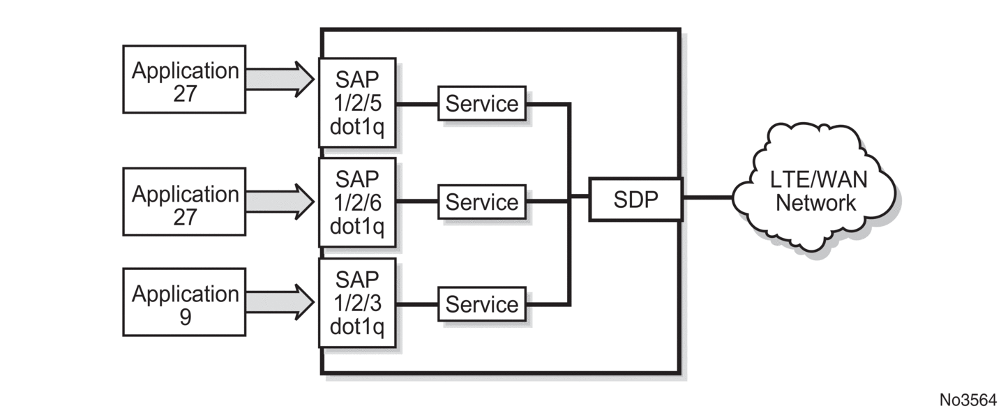 A service access point (SAP) is the point at which a service begins (ingress) or ends (egress) and represents the access point associated with a service. A SAP may be a physical port or a logical entity within a physical port. For example, a SAP may be an Ethernet port or a VLAN that is identified by an Ethernet port and a VLAN tag. Each application service connection is configured to use only one SAP.
