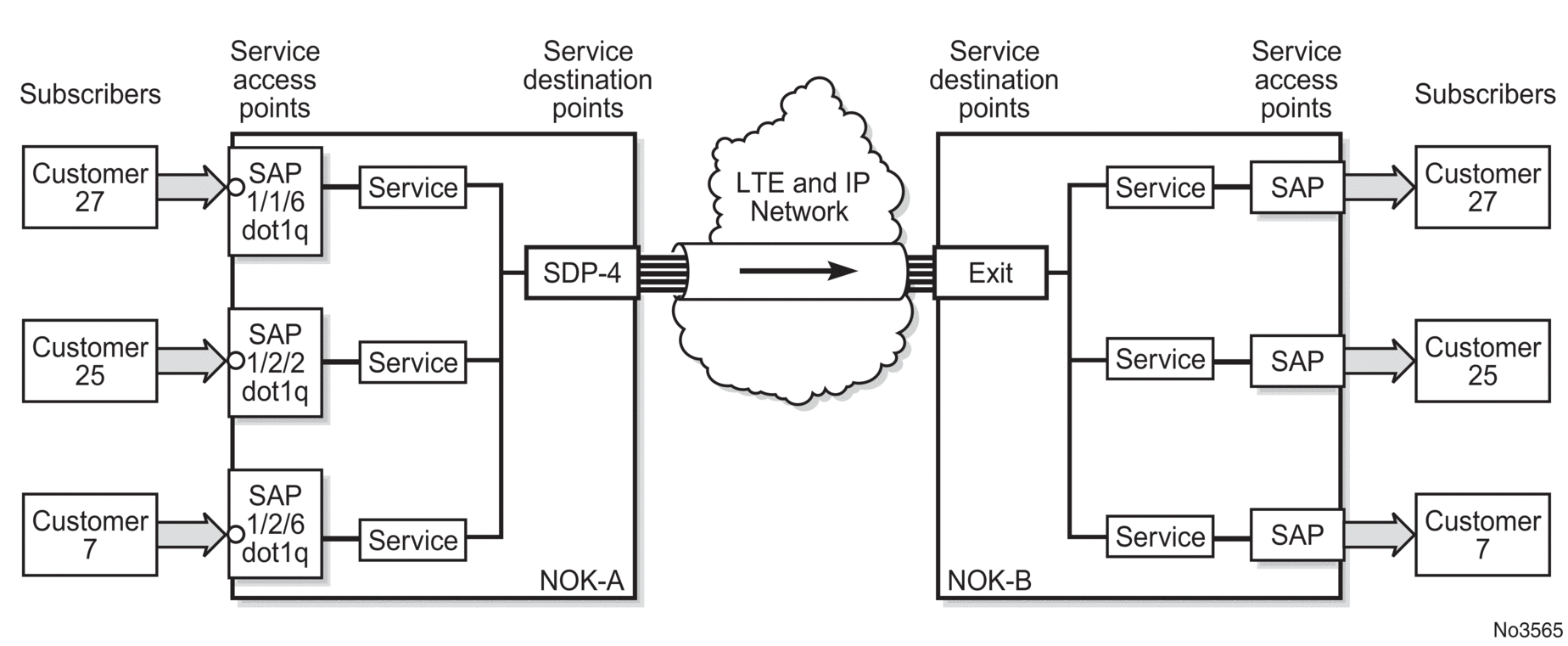 Figure 4 shows an example of how the service entities relate to the service model. An application attachment point (for example, an Ethernet port, VLAN, or serial port) connects to a SAP. The SDPs define the entrance and exit points of service tunnels, which carry one-way traffic between the two routers (NOK-A and NOK-B). Configured SDPs are bound to a service or the service is auto-bound which automatically creates tunnels to far-end nodes. The binding of the service to SDPs is the final step in enabling the end-to-end service. In Figure 4, the entrance and exit points are over the wireless interface.