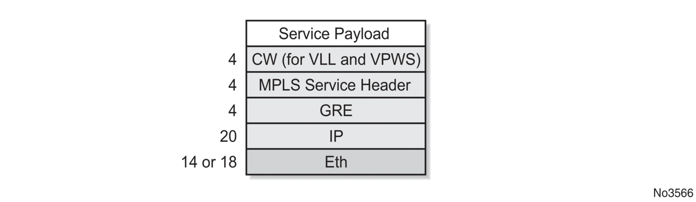 Services payload | The services payload is the payload of the service being encapsulated For VLL, VPWS, and VPLS, this is a Layer 2 frame with either null or with dot.1q encapsulation For VPRN, this is a Layer 3 IPv4 or IPv6 packet without Layer 2 information |