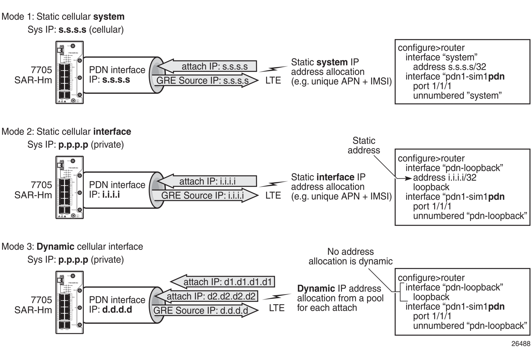 At network egress over a cellular port, the destination IP address of the GRE-MPLS IP header is always the far-end IP address that was either configured for the SDP, or learned through BGP routing. If the far-end address is for a cellular port on another 7705 SAR-Hm series node, then that address could be either the system IP address or the cellular PDN interface IP address, depending on the mode of operation deployed at that far-end location. The source IP address of the GRE-MPLS IP header will always be set to the cellular PDN interface IP address. This address may be statically configured or dynamically assigned to a cellular port. For information about the PDN router interface modes of operation and how the PDN router interface IP address is assigned, see PDN router interfaces.