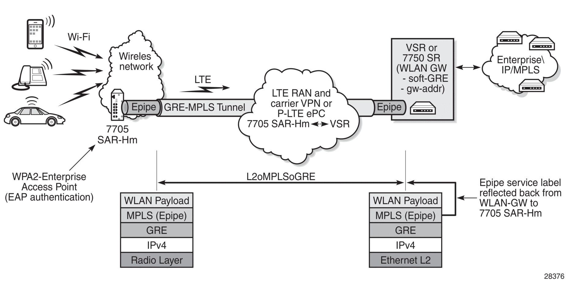 Figure 11 illustrates the use of an Epipe service to connect the WLAN AP on a 7705 SAR-Hm to the WLAN-GW.