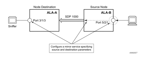 Figure 3 shows a remote mirror service configured as ALA B as the mirror source and ALA A as the mirror destination. Mirrored traffic ingressing and egressing port 5/2/1 (the source) on ALA B is handled the following ways: