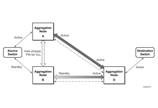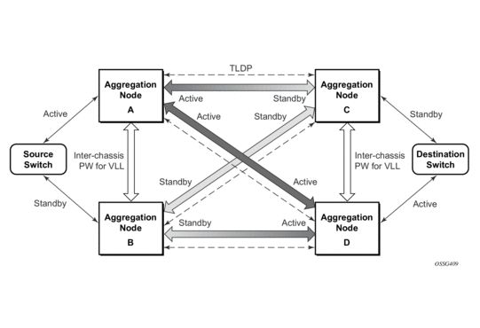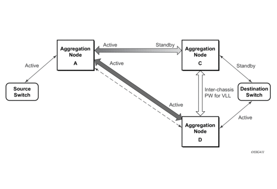 The notable difference with scenarios standard pseudo wire redundancy scenarios is that provided the customer service is redundant on nodes A and B (Figure 10 and Figure 11) both aggregation node A and Aggregation node B maintain an active Pseudo wire to Node D who in turn has an active link to the destination switch. If in the sample in Figure 10, the link between D and the destination switch is disconnected then both aggregation A and B must switch to use pseudo wire connection to Node C.