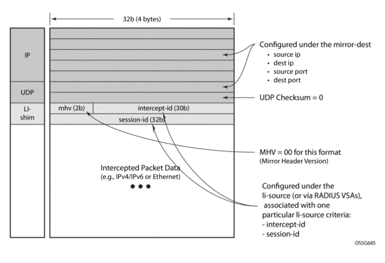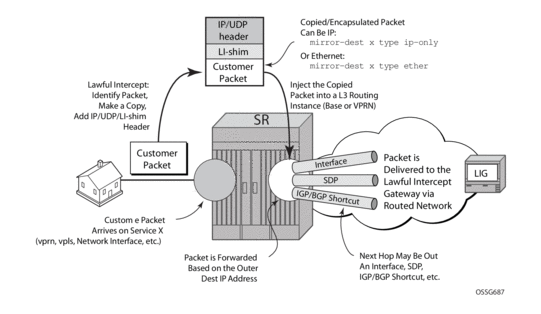 The Routable LI encapsulation feature allows LI mirrored packets to be placed into a routable (for example, IP/UDP) header and then forwarded in a routing context (base or VPRN). An LI-shim inserted before the customer packet allows correlation of packets to LI sessions at the downstream LI Mediation device (LIG).