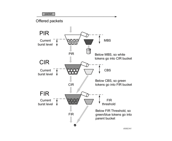When this option is selected, all child policers parented to a root policer will have their FIR bucket track the state of the CIR bucket. In other words, an inplus-profile or in-profile packet will always be blue and an out-of-profile packet will always be orange. When admitting packets from the child policers within a given priority level, orange packets will be allowed up to the discard-unfair threshold while blue packets will be allowed up to the discard-all threshold. If a child policer is configured to forward traffic exceeding its PIR, the exceed-profile traffic does not contribute to the parent policer bucket depth with respect to any of its thresholds.