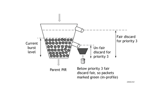 Priority high and low are used in the child policer’s PIR leaky bucket to choose one of two discard thresholds (threshold-be-low and threshold-be-high) that are derived from the child policer’s mbs and high-priority-only parameters. The high threshold is directly generated by the mbs value. The low threshold is generated by reducing the mbs value by the high-priority-only percentage. A packet’s priority is determined while the packet is evaluated against the ingress classification rules in the sap-ingress QoS policy.