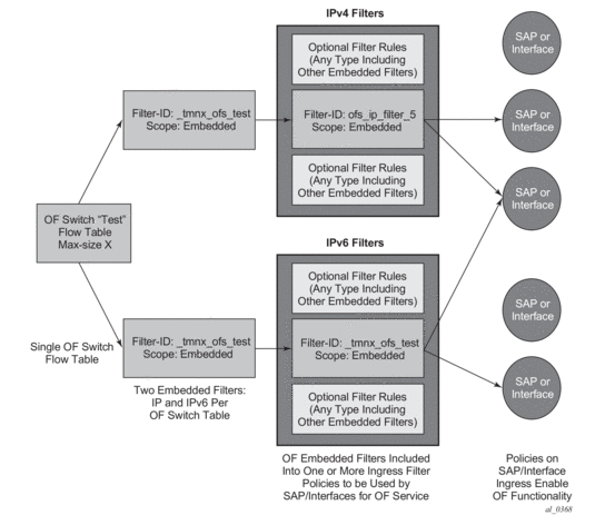 To enable multi-service mode of operation, an operator must embed the OF switch in an ACL filter policy, and, since multi-service H-OFS supports a mix of VPRN/VPLS/GRT/System rules, an additional scope of embedding must be selected (embed open-flow service, embed open-flow system - grt scope used by default). Since after embedding H-OFS instance, an ACL policy contains rules specific to a particular VPRN or VPLS service instance or to a GRT or to a System Filter Policy, the ACL filter policy can only be used in the scope defined by H-OFS embedding.