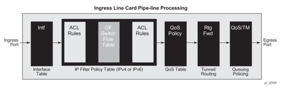 As described in the previous section, an update to an OpenFlow Switch’s flow table, results in the embedded filter update(s), which triggers update to all filter policies embedding those filters. The router automatically downloads the new set of rules to the line cards as defined through service configuration. The rules became part of ingress line card pipeline as depicted in Figure 30.