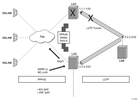 In dual-homed PPPoEv4/v6 wholesale/retail environment over L2TP, the subscriber-hosts are synchronized via Multi-Chassis Synchronization (MCS) protocol. The failover detection mechanism might be implemented via SRRP or Layer 3 MC-LAG with SRRP. When an interface or an entire node fails, the newly selected Master sends PADT to all sessions that were moved over from the failed node.