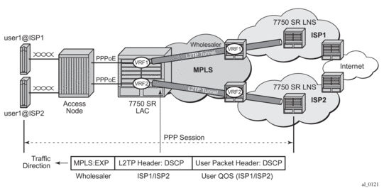 L2TP tunnels provide an IP transport for PPP frames between LAC and LNS. In some existing networks, BGP/MLPS VPNs (VPRN in SR-OS) are used to contain the L2TP traffic (and the routes associated with the LAC and LNS) into a dedicated routing instance.
