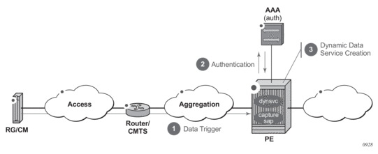 In the data-triggered dynamic data services model, any frame arriving on a dynamic data services capture SAP can result in RADIUS or local authentication. The dynamic data service is then created from a Python script that generates CLI snippets using parameters obtained from authentication.