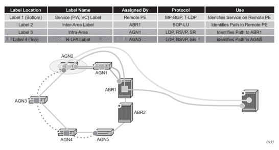 Seamless MPLS with Fast Restoration requires up to four labels to be pushed by AGN2, as shown in Figure 10.
